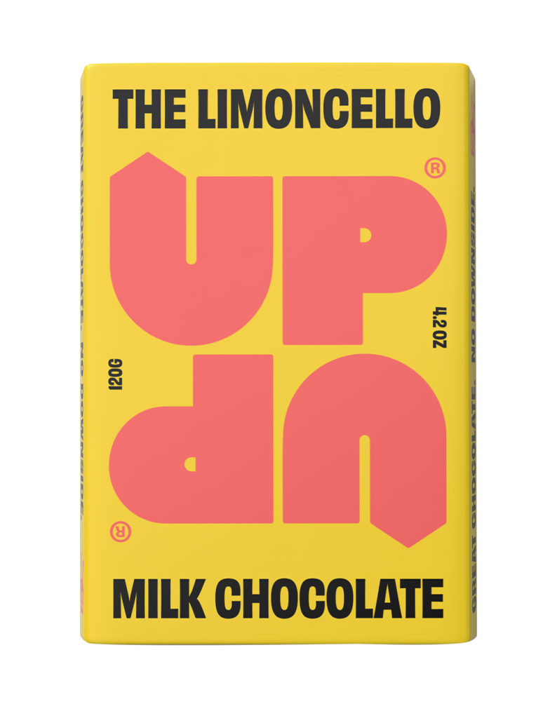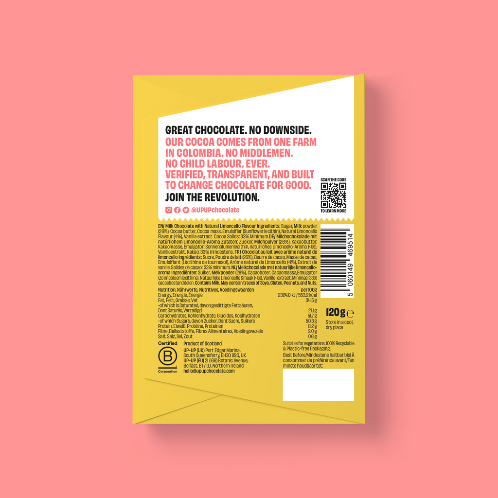 UP-UP Limoncello Chocolate is inspired by Italy’s beloved liqueur. Crafted with Single Estate 35% cacao from fine flavour cocoa beans grown at the renowned "El Rosario" farm in Colombia’s Necoclí region, this bar is infused with the vibrant zest of limoncello flavour. The result is a delightful blend of creamy sweetness and refreshing citrus notes, offering a perfectly balanced and taste of sunshine in every bite.